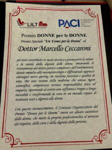 Un riconoscimento speciale nell’ambito del Premio “Donne per le donne” promosso dalla Lega Italiana per la Lotta contro i Tumori – LILT di Roma e l’Associazione Professionisti d’Azienda Crisi d’Impresa-PACI. La motivazione: “Un alleato autentico delle donne, che mette la propria professionalità al servizio del rispetto, della Cura e della dignità della persona”.